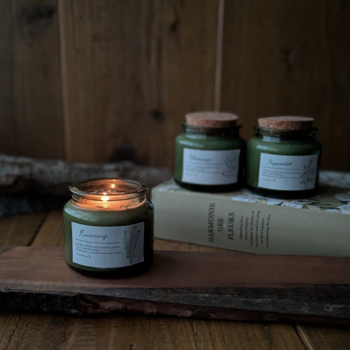 キャンドル アロマ 香り 木芯 焚き火 癒し お風呂 ソイワックス グリーン瓶 ホワイトセージ ローズマリー 檜 ペパーミント ユーカリ