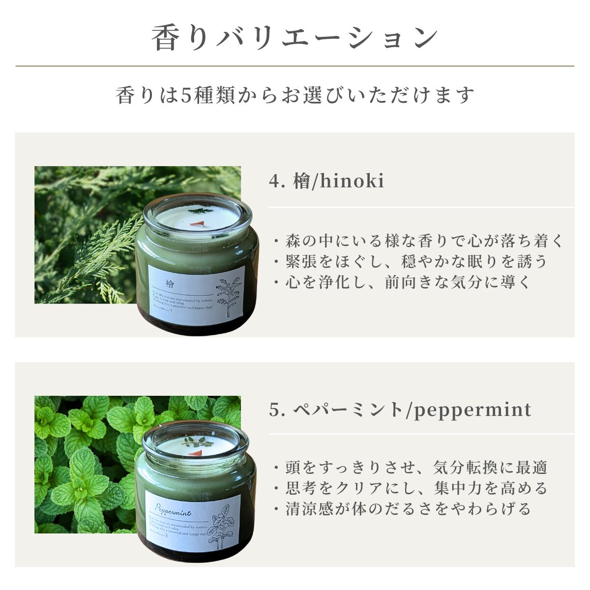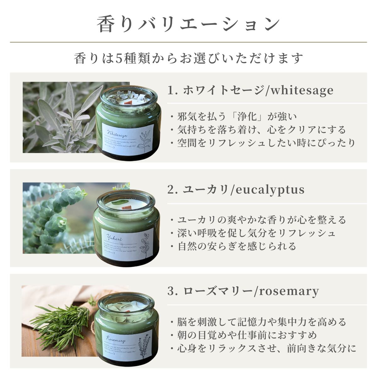 ホワイトセージ・ペパーミント・ユーカリ・ローズマリー・ヒノキ