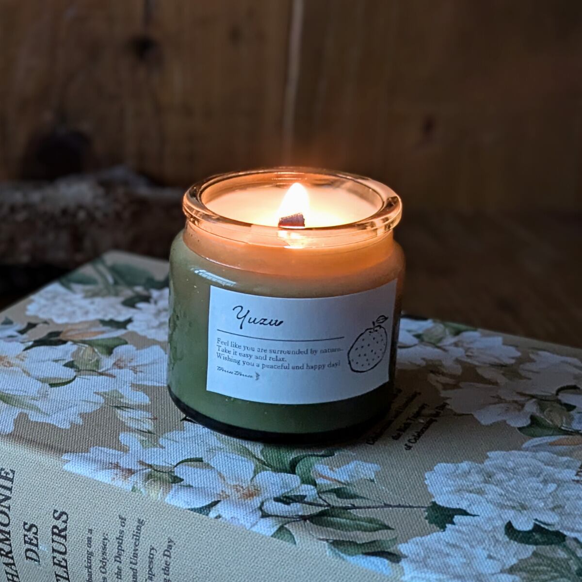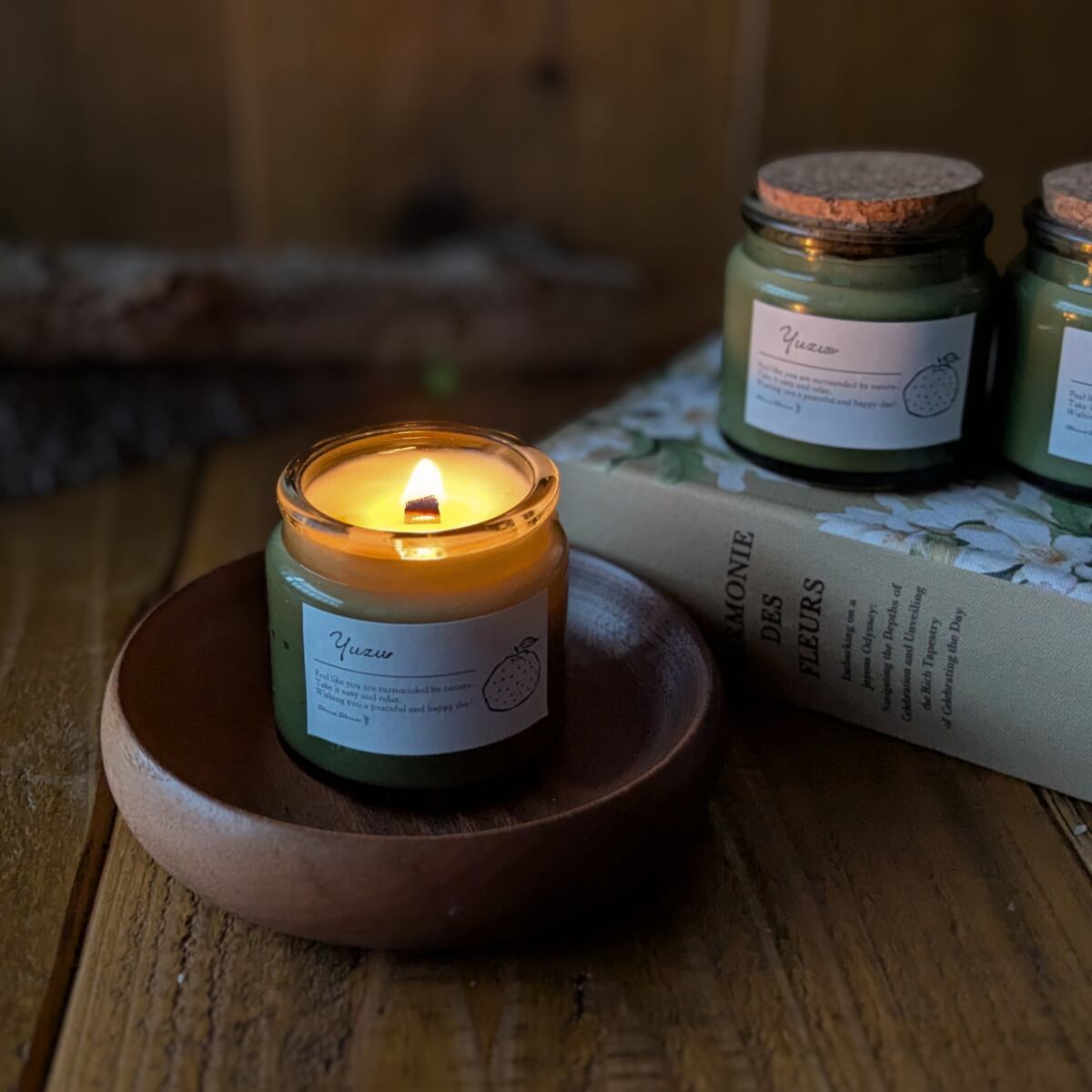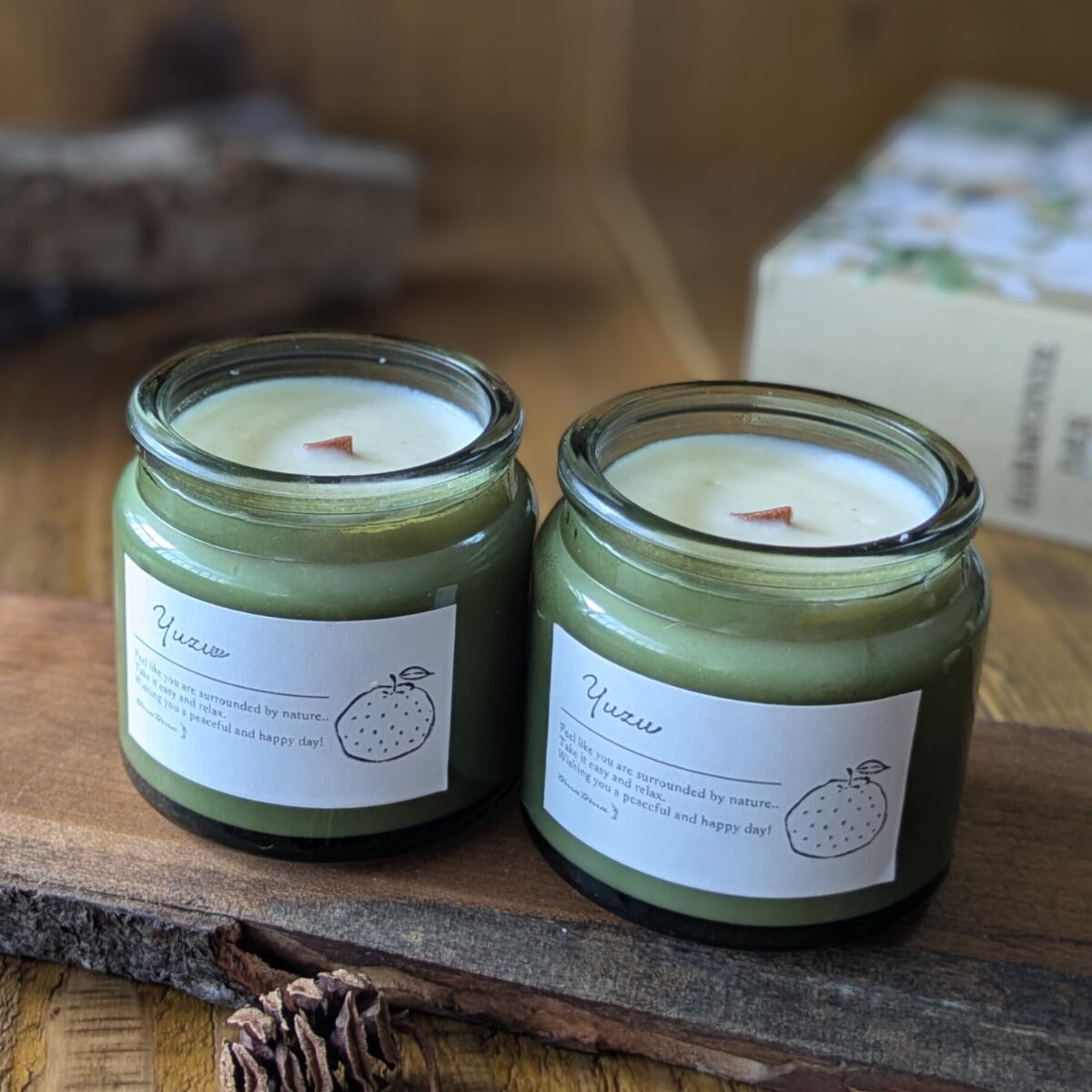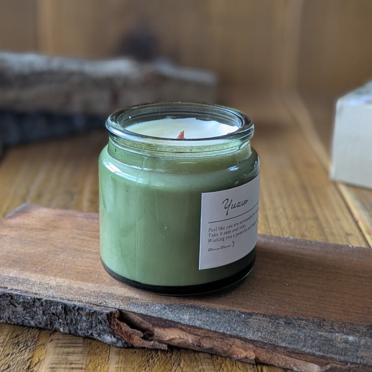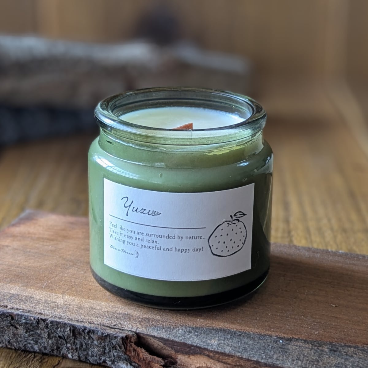 キャンドル アロマ 香り 木芯 焚き火 癒し お風呂 ソイワックス グリーン瓶 柚
