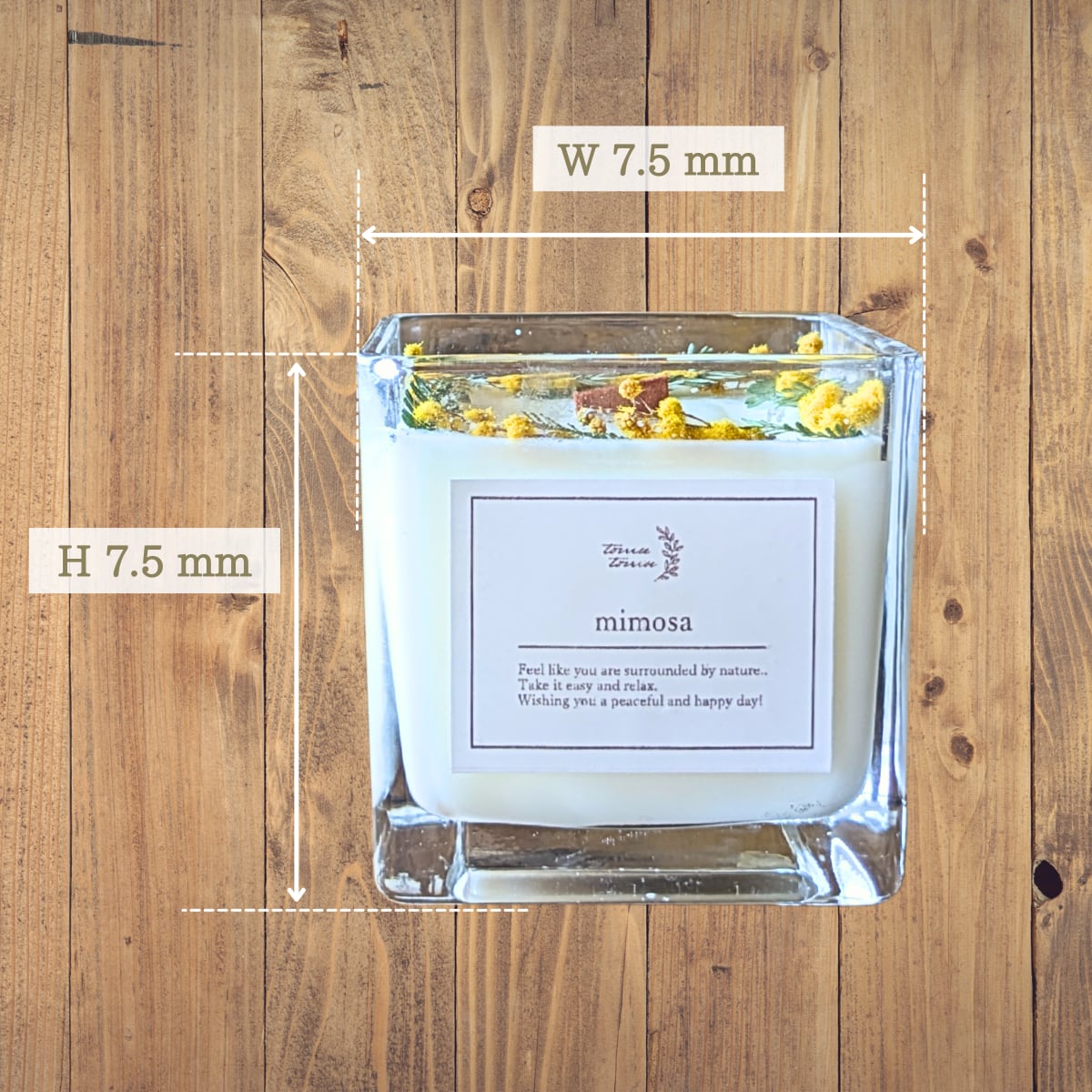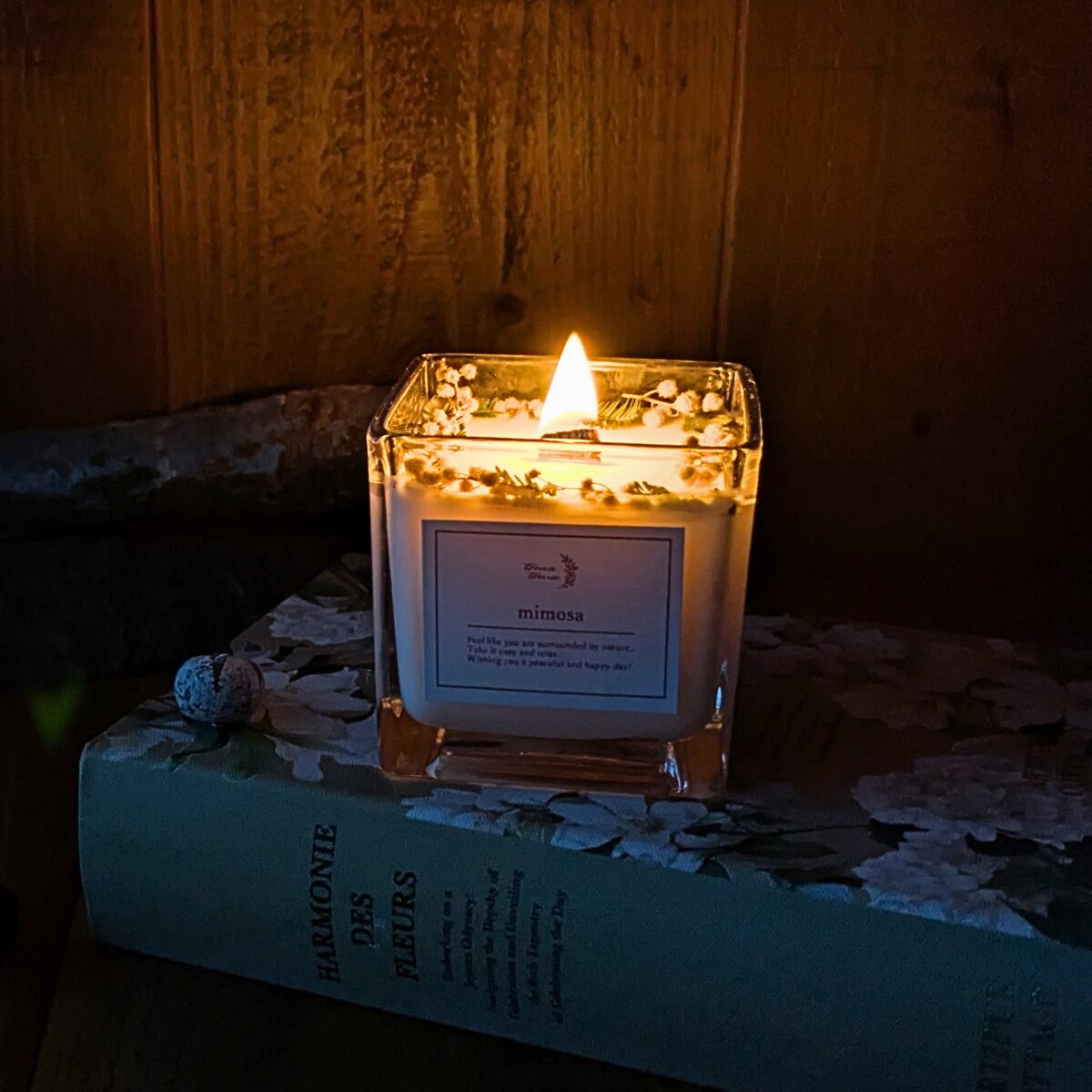 上面にはミモザのドライフラワーを贅沢に飾り、火を灯さなくても可愛いインテリアに。