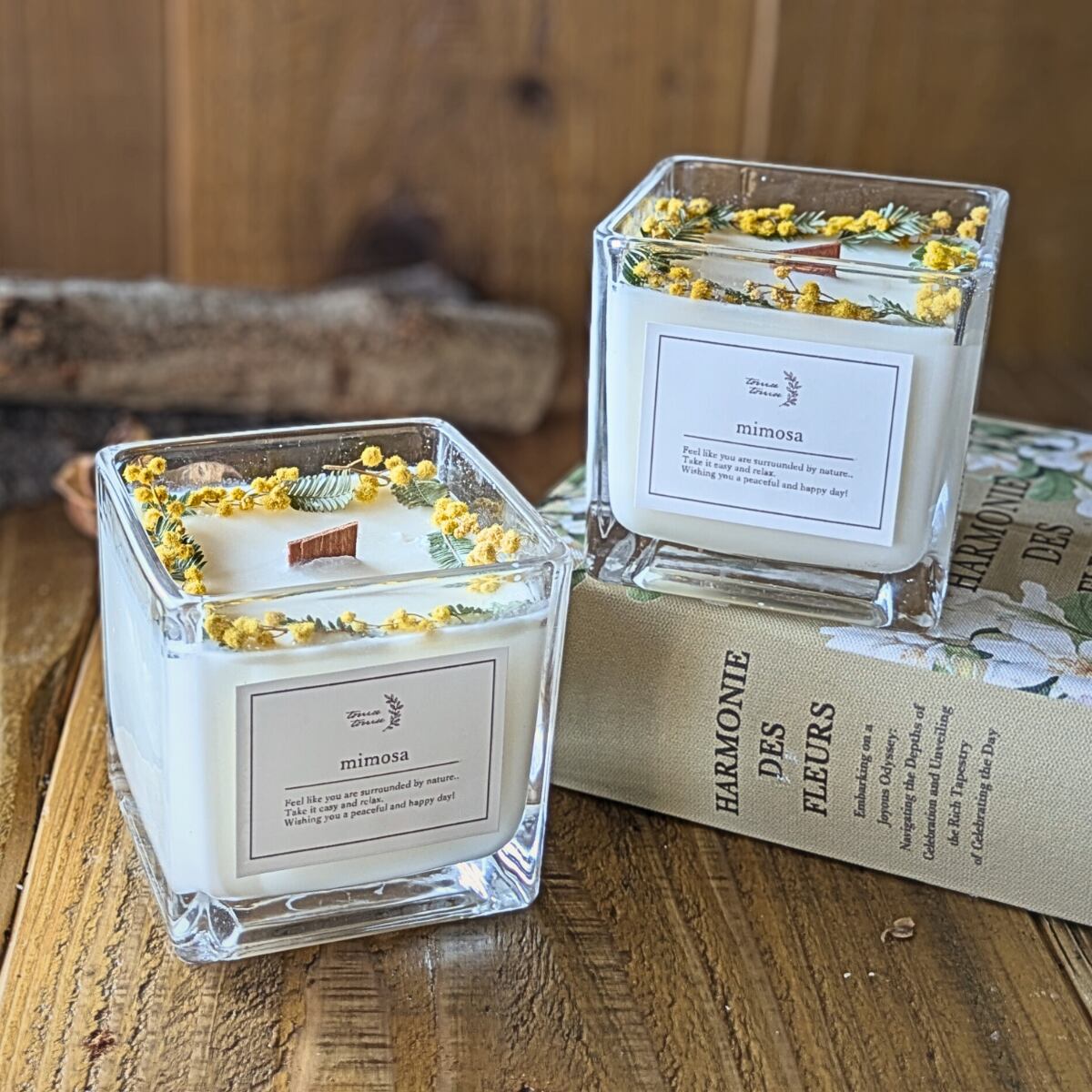 ミモザキャンドル / アロマキャンドル / 木芯キャンドル / ソイワックス / 焚き火 / ギフト / 癒し / リラックス